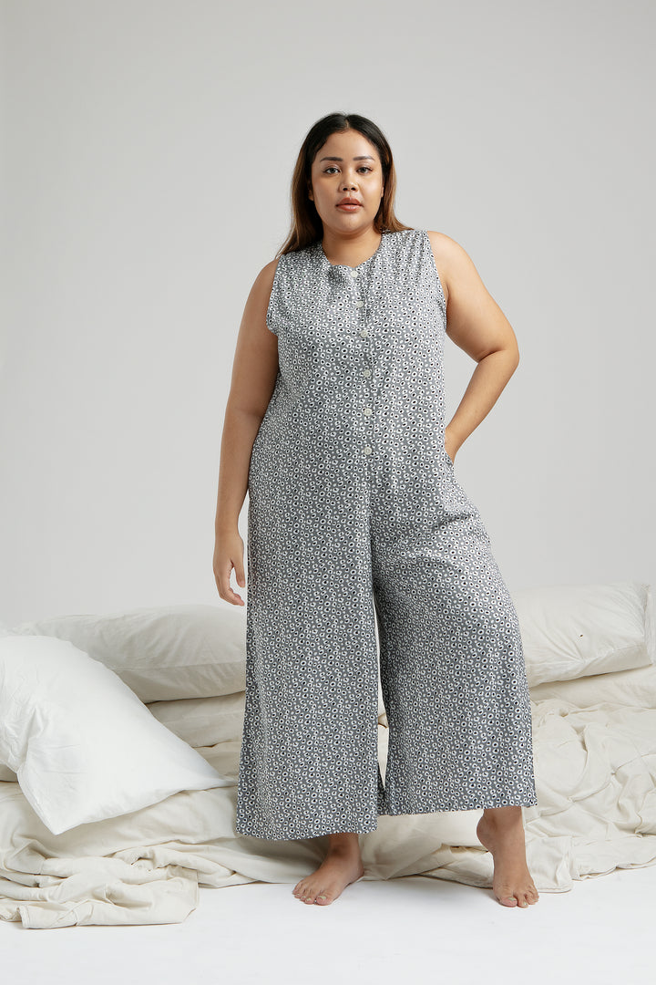 Banda jumpsuit is the perfect choice for comfort and movement. Made for lazy outdoor days, coffee in bed, or fun under the sun. This piece boasts a front button opening and wide-leg silhouette for your wardrobe go-to.