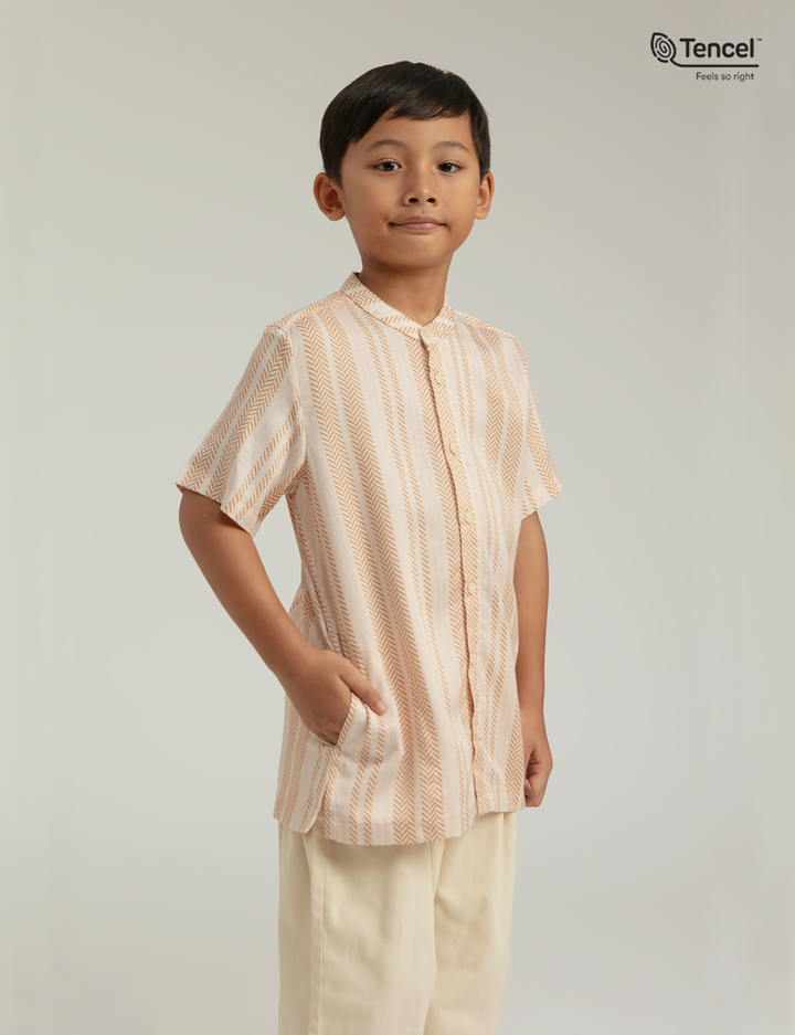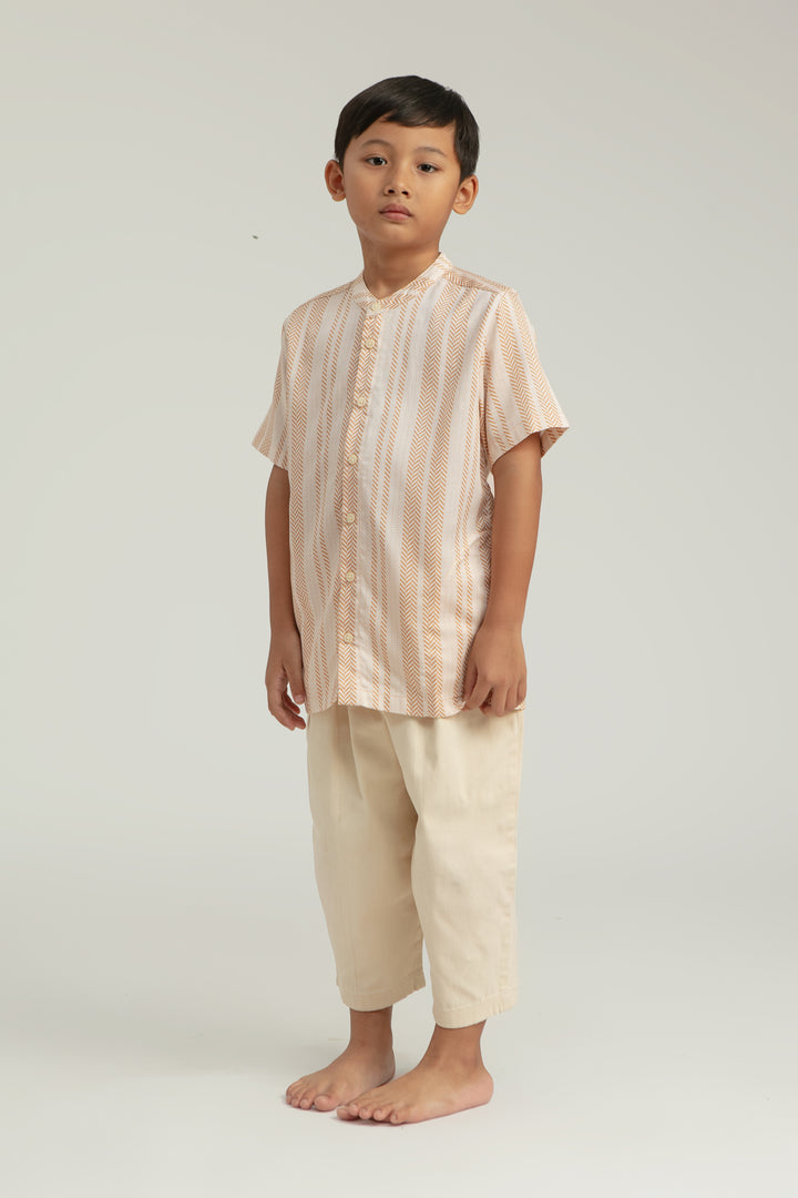 Buji kids shirt features the classic stand collar. Must have for any family occasion. Pair with any khaki pants to make this look even more comfortable.