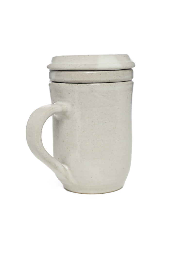 A compact set of mug, tea and strainer that will take your tea routine to a whole new experience. The set of strainer and mug let you brew and steep your tea while the lid keep the drink warm and covered. Whether you are relaxing or enjoying it on the go, the mug is a perfect addition and a must-have to any avid tea drinker. The mug is hand thrown by the studio of AL ceramics on a potter's wheel, glazed in Zirconium white, fired to cone 6.