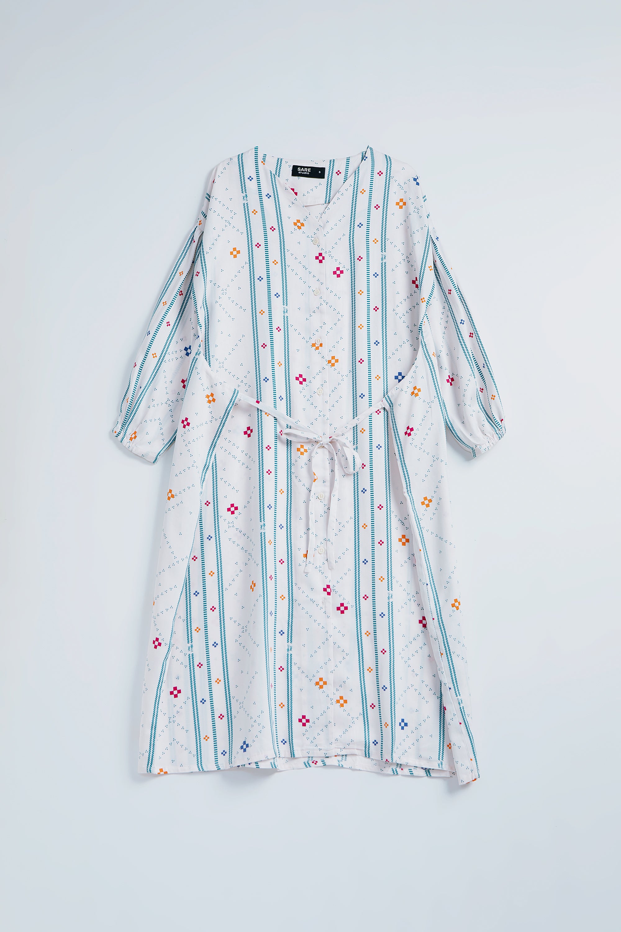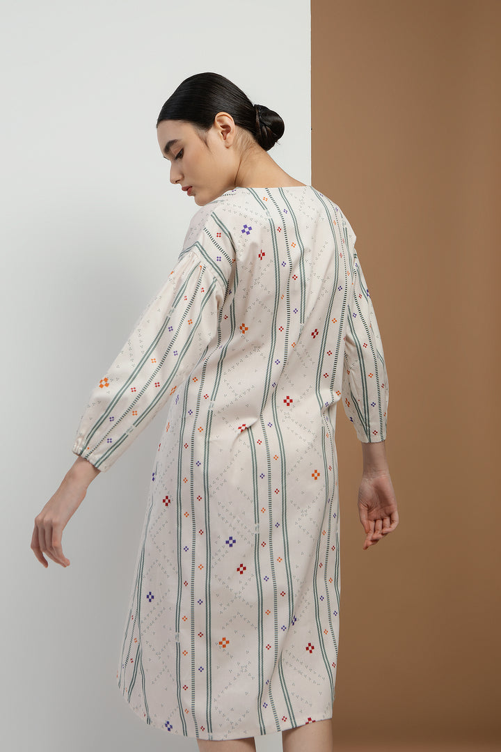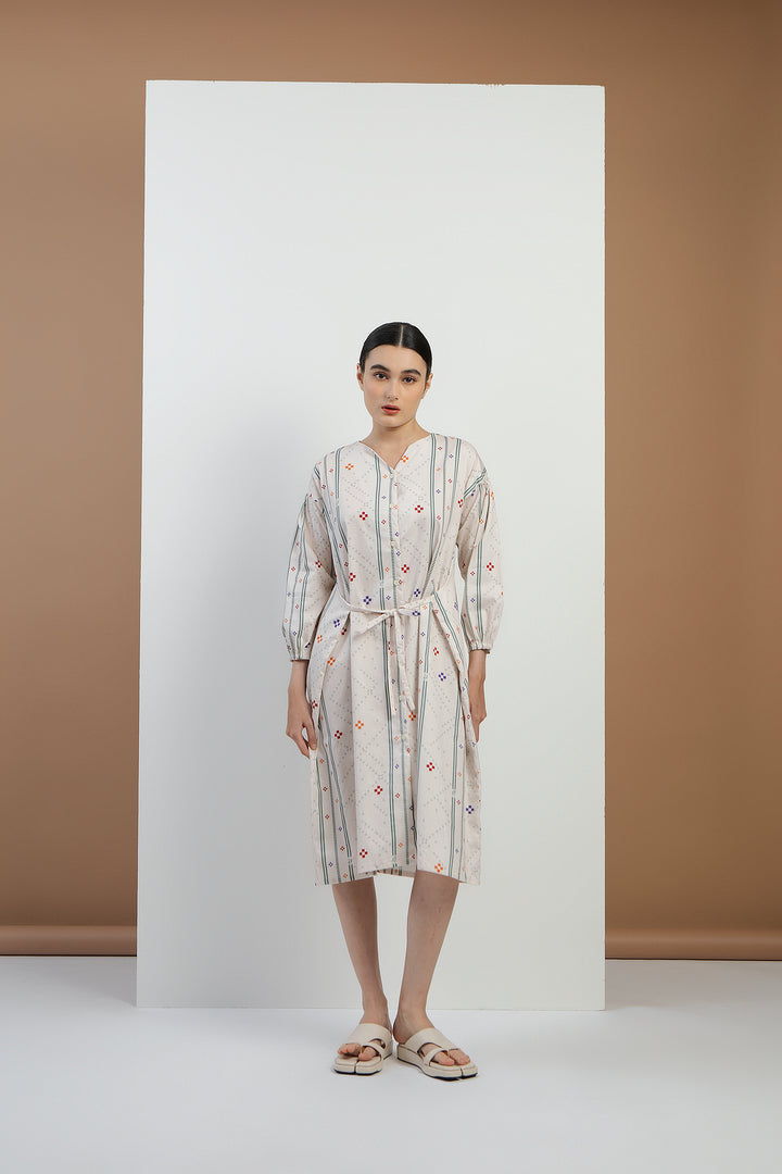 The Limau Tunic features a relaxed drop-shoulder design with elegant puffy long sleeves for a chic, effortless look. Secured with adjustable ties at the waist, it offers a flattering, customizable fit. Perfect for any occasion, this tunic blends comfort with timeless sophistication.