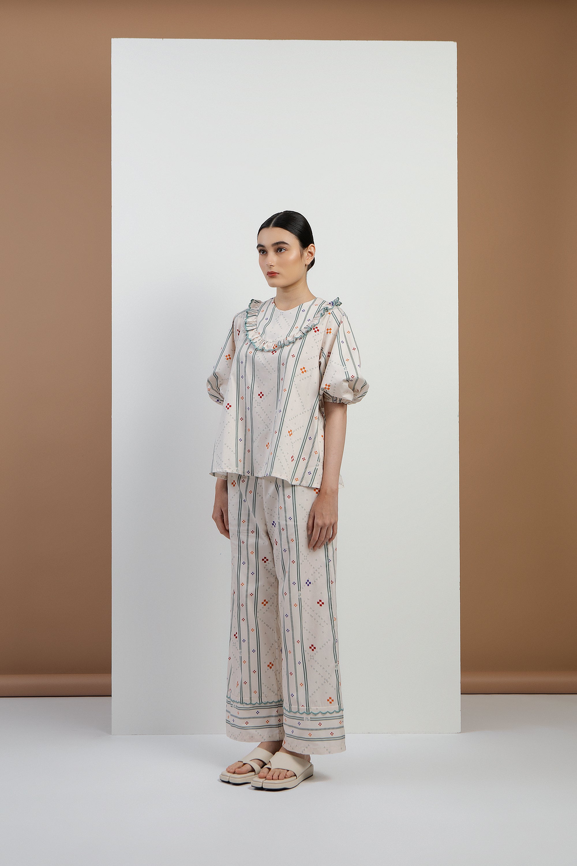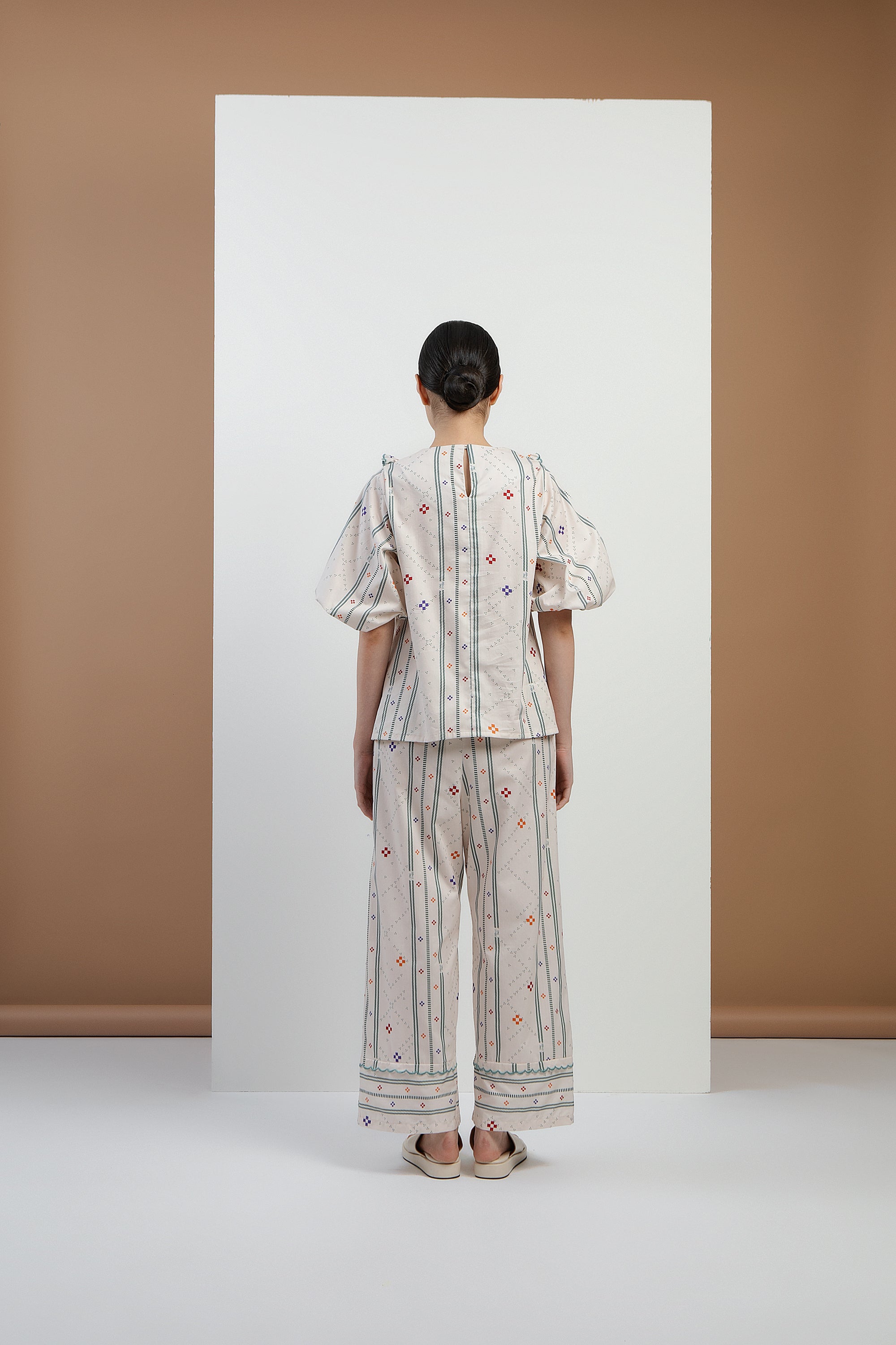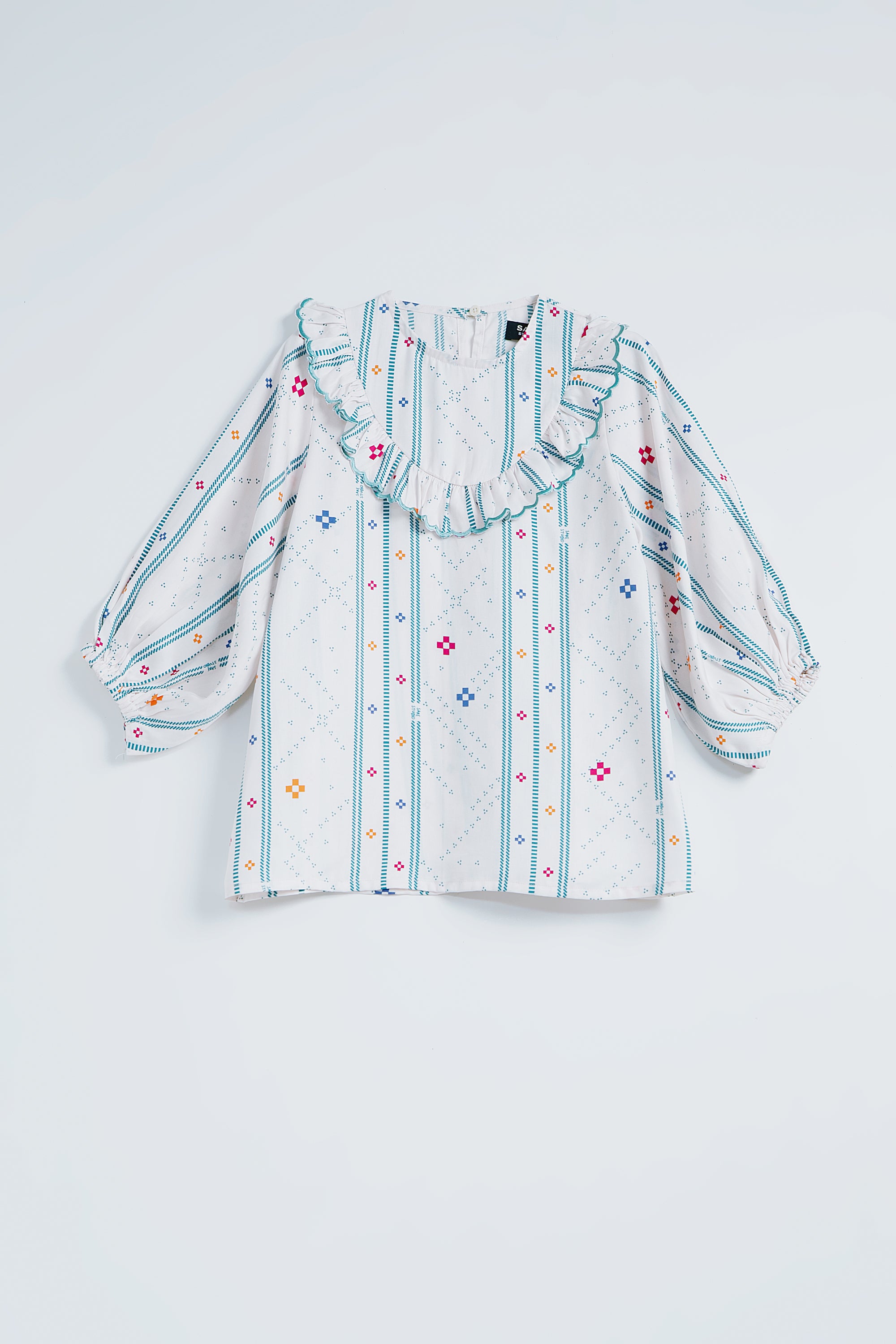 The Pasia Top features a flattering A-line silhouette with elegant 3/4 puffy sleeves. Delicate ruffles embroidery in contrast teal adorns the chest, adding a refined touch to this timeless piece.