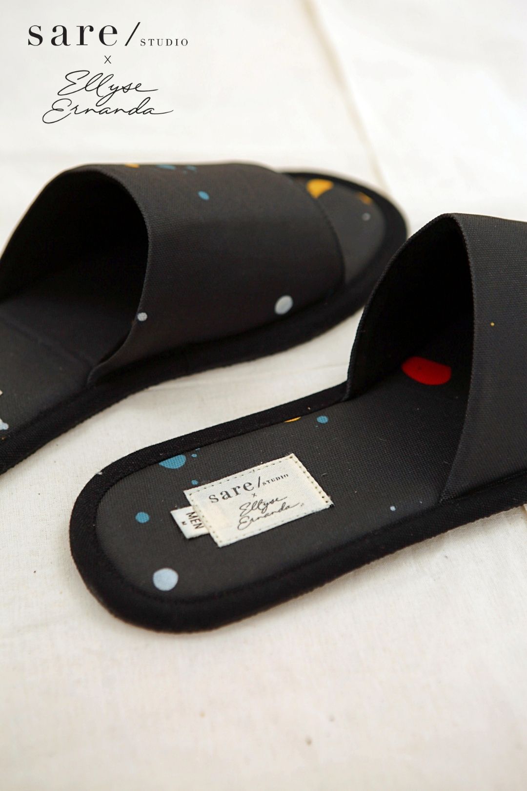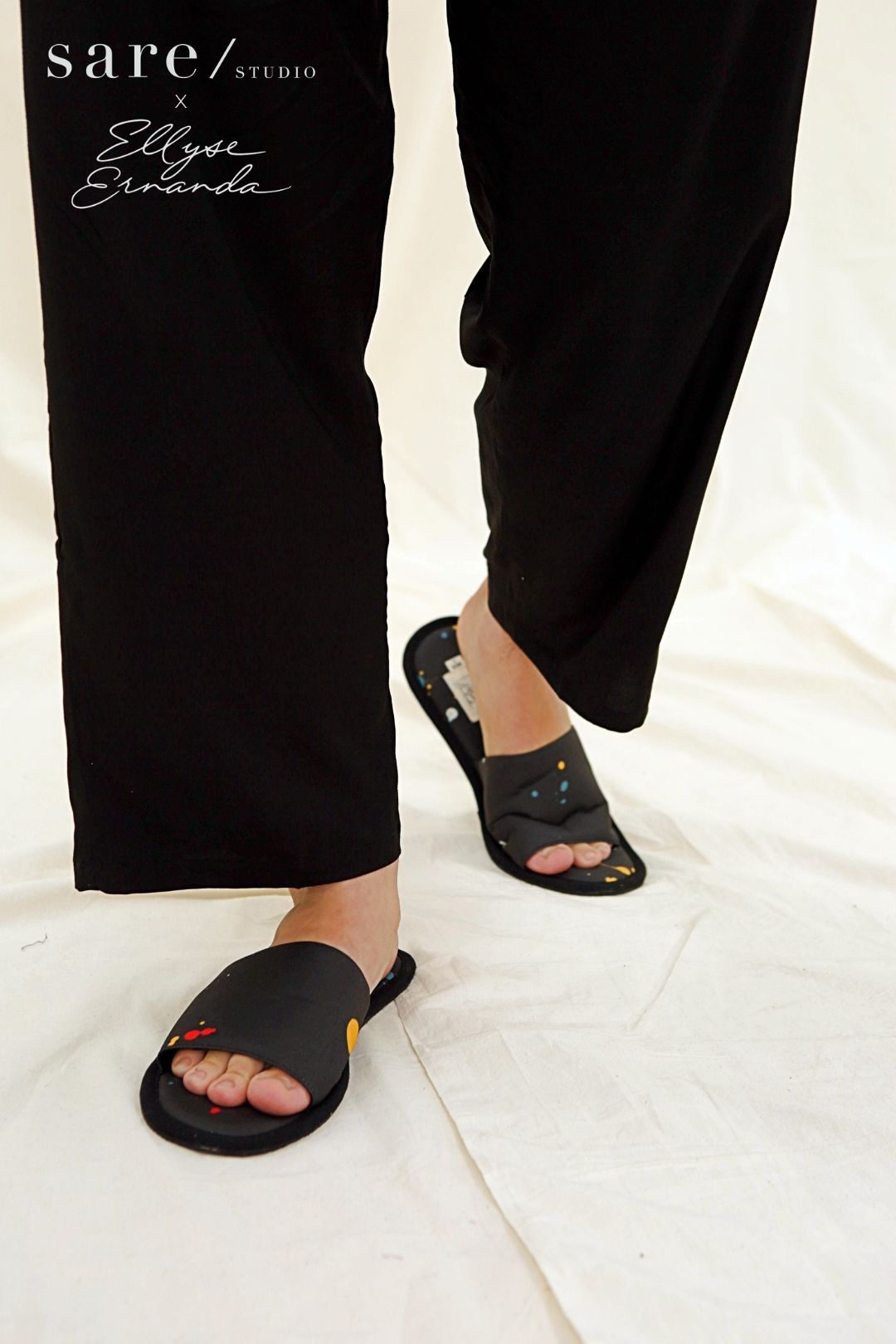For Zoom-heavy workdays, weekends on the couch, and everything in between, invest in this SARE/ studio x Ellyse Ernanda house slipper. Available in exclusive Off Black Splats pattern.